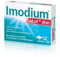 Imodium® akut N duo. Zusammensetzung: Arzneil. wirks. Bestandt.: 1 Tbl. enth.: 2 mg Loperamidhydrochlorid und Simeticon (entspr. 125 mg Dimeticon). Sonst. Bestandt.: H2O-freies Calciumhydrogenphosphat, mikrokristalline Cellulose, Carboxymethylstärke-Natrium (Typ A), Acesulfam-Kalium, Stearinsäure [pflanzlich], Vanille-Aroma künstlich (enthält: Maltodextrin, Propylenglycol u. Benzylalkohol). Anwendungsgebiete: Symptomatische Behandlung akuter Durchfälle b. Erwachsenen u. Jugendlichen ab 12 Jahren, wenn dabei auch abdominelle Beschwerden auftreten, die durch eine vermehrte Gasbildung verursacht werden m. einem aufgeblähten Bauch, Krämpfen od. Blähungen. Gegenanzeigen: Allergie gegen Loperamidhydrochlo